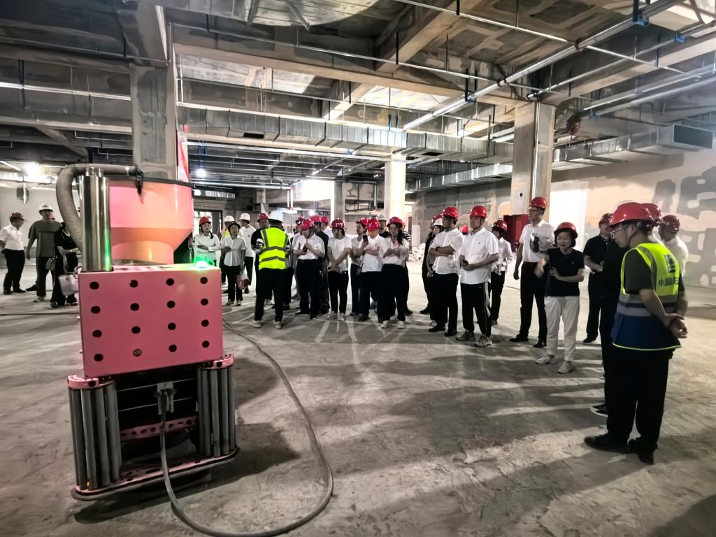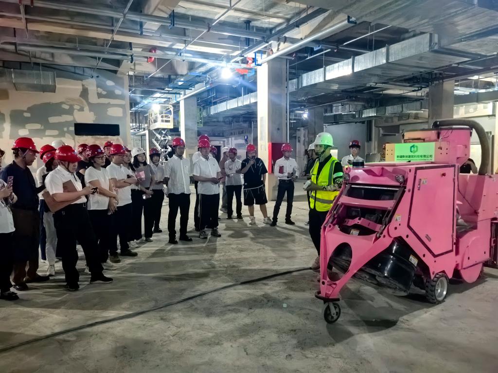 新建聯總工程師沈斌引導大家走進中建三局兩港產業園防空地下室施工現場,觀摩了四輪混凝土整平機、墻面處理一體機等建筑機器人在建筑墻面的打磨、噴涂施工作業。