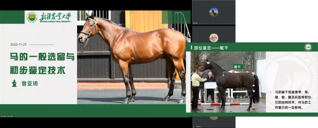 11月25日——馬的一般選留及初步鑒定技術,由新疆農業大學曾亞琦老師授課,向我們介紹馬的選留原則和馬的經濟類型,同時通過頭部、頸部、耆甲、背部、腰部、尻部、尾、胸、腹、四肢、蹄等十一個部位,從頭到尾、從上到下詳盡地闡述馬匹各部位的鑒定原則和方法。