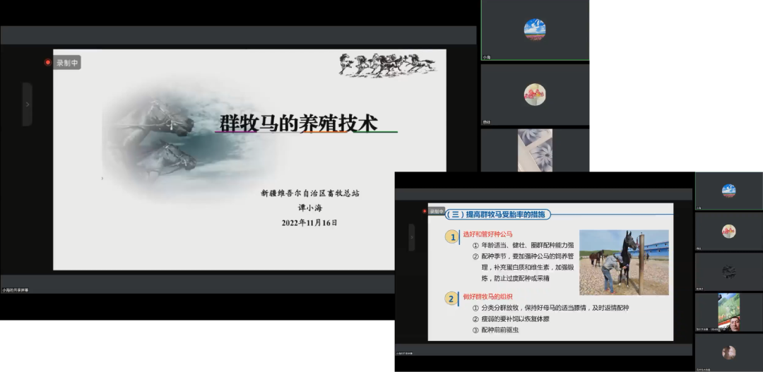 11月16日——群牧馬的養殖技術,由自治區畜牧總站譚小海老師授課,通過從群牧養馬的優缺點、群牧馬的生物學特性、四季放牧管理要點、四季放牧草場的劃分與利用、繁育技術、日常管理技術以及群牧養馬的基本建筑和設備等七個方面,綜合地講述群牧養馬過程中的注意事項,為提高群牧養馬的生產性能和經濟效益提供理論基礎。