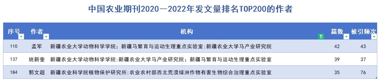 此外,在同期發布的研究成果中,《新疆農業科學》在中國農業期刊2022年度影響因子排名TOP100的期刊(農林牧漁機械等大農業學科)中排第85位;本刊2020-2022年高發文量作者郭文超,姚新奎,孟軍入選中國農業期刊2020—2022年發文量排名TOP200。