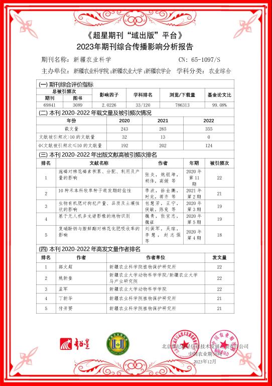 12月28日,由北京世紀超星信息技術發展有限責任公司和中國農業期刊網聯合研制的《中國農業期刊綜合傳播影響分析報告》(2023版)發布。該報告基于中國農業期刊網學術期刊,以2020—2022年為評價年份,對各個期刊的綜合傳播影響力進行定量統計與分析。《新疆農業科學》影響因子為2.0226,總被引頻次72930(其中期刊為69841,圖書為3089),在農業綜合類120種期刊中排名第33位。