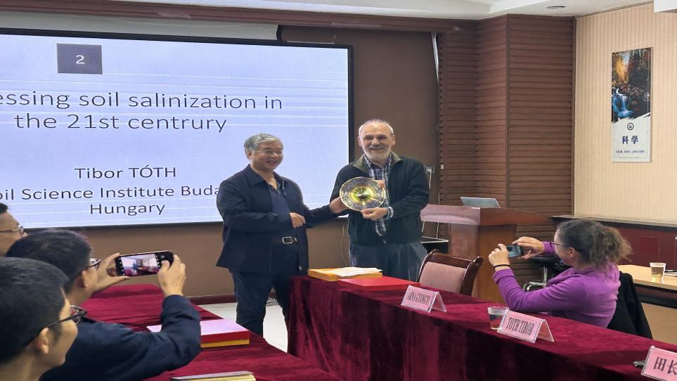 9月14日--15日,應(yīng)新疆土壤與肥料學(xué)會(huì)理事長、中科院新疆生地所田長彥研究員邀請(qǐng),匈牙利科學(xué)院土壤與農(nóng)業(yè)化學(xué)研究所、前國際土壤學(xué)聯(lián)合會(huì)鹽漬土專業(yè)委員會(huì)主席Toth Tibor教授及Barna Gyongyi一行二人來疆進(jìn)行學(xué)術(shù)交流。并做了題為“Assessing soil salinity in the 21 centyry”的學(xué)術(shù)報(bào)告。田長彥理事長致歡迎詞并代表學(xué)會(huì)贈(zèng)送學(xué)會(huì)標(biāo)識(shí)紀(jì)念牌。