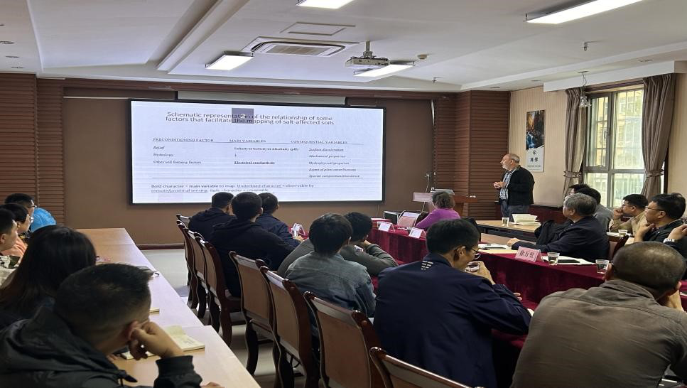 報(bào)告會(huì)由學(xué)會(huì)常務(wù)理事周宏飛研究員及秘書長買文選共同主持,新疆土壤與肥料學(xué)會(huì)成員、中科院新疆生地所、新疆農(nóng)科院土壤肥料和農(nóng)業(yè)節(jié)水研究所等近120人線上線下參加了報(bào)告會(huì)。Toth Tibor教授圍繞21世紀(jì)土壤鹽漬化評(píng)估問題,結(jié)合世界各地不同下墊面鹽堿土壤的研究案例,重點(diǎn)介紹了鹽堿土數(shù)字制圖方法,指出鹽漬土壤鹽份時(shí)空分布圖繪制的難點(diǎn)和今后的方向。報(bào)告會(huì)后,Tibor教授同參會(huì)人員就相關(guān)學(xué)術(shù)問題進(jìn)行了熱烈互動(dòng)和深入交流。此次學(xué)術(shù)交流拓寬了參會(huì)人員在鹽漬化領(lǐng)域的研究視野,豐富了研究思路,參會(huì)者紛紛表示受益匪淺。報(bào)告會(huì)后在學(xué)會(huì)相關(guān)人員陪同下參觀了新疆自然博物館,之后赴中科院新疆生地所阜康荒漠生態(tài)國家野外科學(xué)觀測(cè)研究站、克拉瑪依市鹽土農(nóng)業(yè)區(qū)和鹽堿地生物改良試驗(yàn)場(chǎng)進(jìn)行研討和實(shí)地考察。
