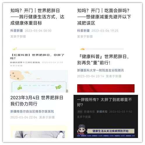 借助多媒體平臺,發(fā)揮專家優(yōu)勢加大對活動的宣傳力度,通過新疆科協(xié)官網(wǎng)等公眾平臺宣傳世界肥胖日活動主題海報、世界肥胖日中國主題宣傳片等系列肥胖防控科普知識。組織專家、會員、注冊營養(yǎng)師圍繞主題撰寫制作科普文章、科普短視頻等。通過科普新疆平臺發(fā)布原創(chuàng)科普文章2篇,通過新醫(yī)微訊、新疆疾控等10余個公眾平臺進(jìn)行專題宣傳,共發(fā)布科普專欄文章10多篇。