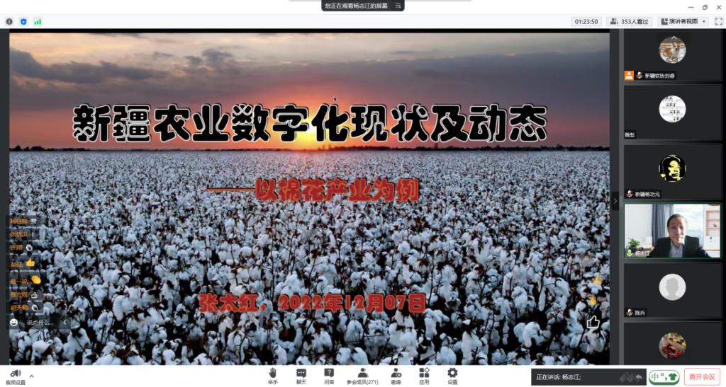 12月7日,由自治區科協指導,新疆電子學會、新疆計算機學會、新疆軟件行業協會(以下簡稱:新疆IT三會)主辦的2022年“信息助力 智慧農業”發展論壇在線上舉辦。來自各行業領導和專家、駐村工作隊工作人員、科研高校師生、行業協會以及數字農業領域的專家及相關企業代表370余人齊聚云端,共同研討交流智慧農業的研究進展,聚焦數字農業應用與創新,傳遞數字農業高新技術,分享智慧農業的應用案例和成果經驗,助力智慧農業發展。