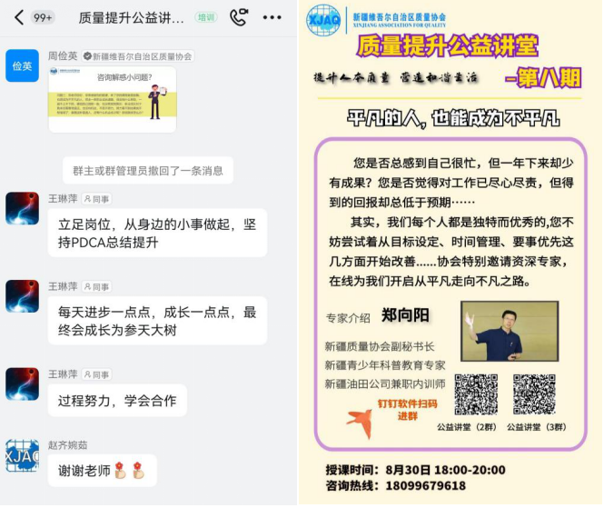 近年來在服務企業過程中,有不少質量同仁反映“自己工作努力,但卻少有成果?嘗試改變,但效果卻不理想?”為更好的服務廣大質量工作者,8月30日,新疆質量協會特邀專家圍繞“平凡的人,也能成為不平凡”主題,以線上形式繼續開展質量提升公益講堂系列活動。