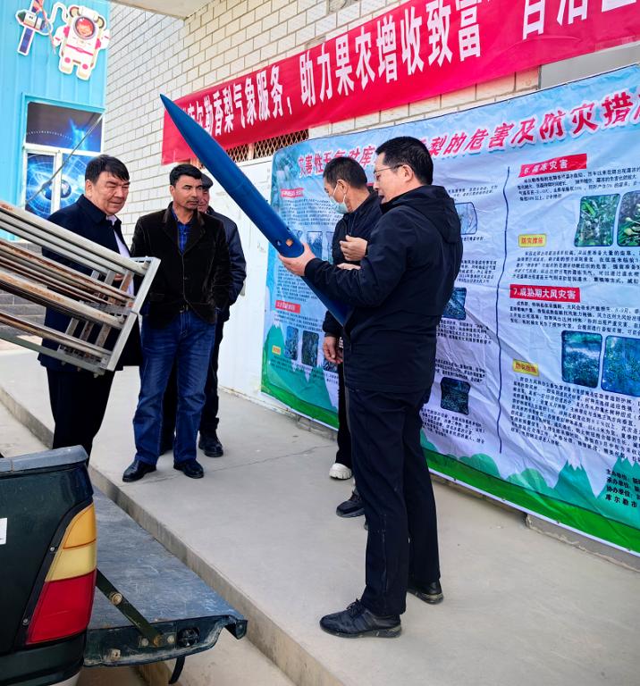 圖為巴州氣象局高級工程師吳新國在講解人影作業車對香梨冰雹災害的防災減災作用以及操作方法。