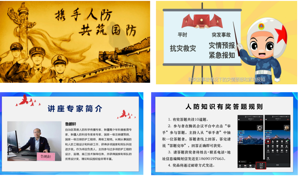 新疆人防科技協(xié)會作為本次活動(dòng)的承辦單位,在人防辦、科協(xié)的指導(dǎo)下,緊緊圍繞“喜迎二十大科普向未來”這個(gè)主題,在烏魯木齊市靜態(tài)管理期間,精心策劃,周密安排,精心組織,積極籌備,按期推進(jìn),嚴(yán)格審查,確保效果。此次全國科普日暨“9·18”警報(bào)試鳴日活動(dòng)依托騰訊會議系統(tǒng)開展線上直播活動(dòng)?;顒?dòng)開始,通過播放人防科教宣傳片,組織自治區(qū)首席人防科學(xué)傳播專家魯鵬軒開展人防知識精彩講座及互動(dòng),并設(shè)置有獎(jiǎng)問答環(huán)節(jié),進(jìn)行線上有獎(jiǎng)競答,將活動(dòng)推向高潮,答題正確的10名同志均獲得了精美紀(jì)念品。播放新疆藍(lán)天救援隊(duì)隊(duì)員開展的心肺復(fù)蘇搶救、急救包扎等防災(zāi)減災(zāi)技能演示體驗(yàn)視頻,網(wǎng)友紛紛留言稱贊。
