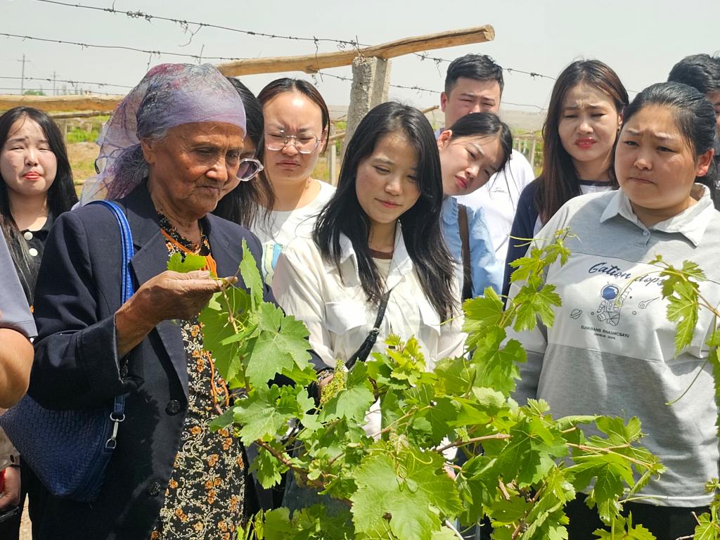 講述結束后,海力其汗親自帶領大家參觀了她現在的葡萄種植基地,給大家認真的講述了她在葡萄和其它新疆特色林果栽培技術方面正在試驗的新技術和新突破,大家看到已年近耄耋的園藝科技工作者仍然堅守著她所熱愛的事業,在孜孜不倦地探索和奉獻,大家深受觸動。