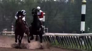 巧合的是,“暴徒”和“愚者之樂”的御用騎師都是JacintoVasquez,面對抉擇,Jacinto毫不猶豫選擇策騎“暴徒”,因此“愚者之樂”不得不另請騎手。對決早段,“暴徒”處于領先位置,然而就在跑過600米處時,意外發生了!賽場上幾只飛鳥的突然出現使得“暴徒”受到了驚嚇,隨之而來的是兩名騎師都能聽到的骨頭碎裂聲——“暴徒”的右前腳骨折。騎師當時想勒停它結束比賽,但強烈的斗心驅使著這匹不敗的女漢子繼續奔跑,它不顧騎師的指令,直到騎師躍下馬背,“暴徒”的速度才開始減慢。
