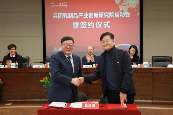 為了加快我區乳制品產業鏈建設,加強兵團乳制品行業科技創新,推動相關乳企高質量發展,2月23日,兵團乳制品產業創新研究院在新疆微生物學會理事單位——天潤乳業股份有限公司正式揭牌成立。研究院依托天潤生物科技有限公司,與石河子大學、新疆大學、中國農業科學院、北京中醫藥大學等單位攜手共建。兵團工業和信息化局黨組成員、副局長顧成奎,兵團科技局黨組成員、副局長李弘出席揭牌儀式。中國工程院院士任發政、農業農村部食物與營養發展研究所所長王加啟、國際食品科學院院士王強線上參會。新疆微生物學會理事、石河子大學食品學院倪永清教授作為特邀專家參與研究院啟動會簽約儀式,并與天潤乳業黨委書記、董事長劉讓簽署了研究院共建協議。