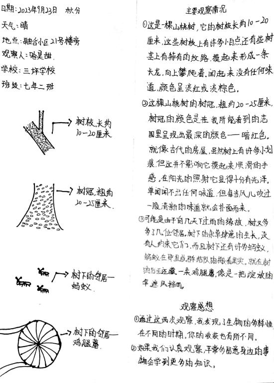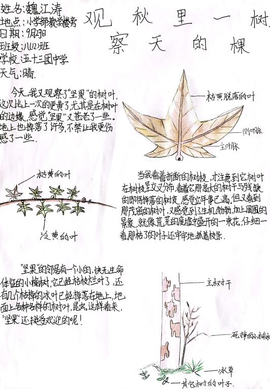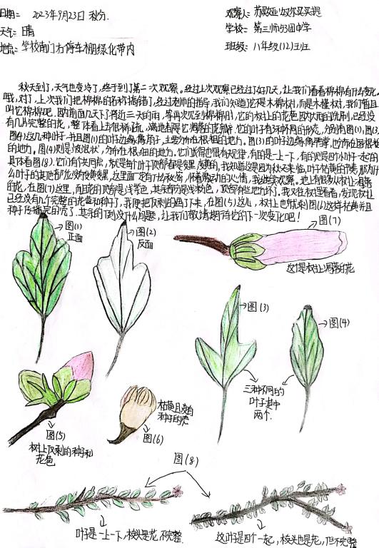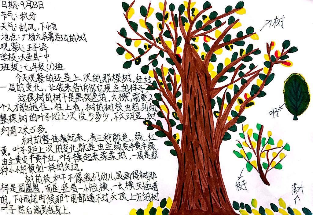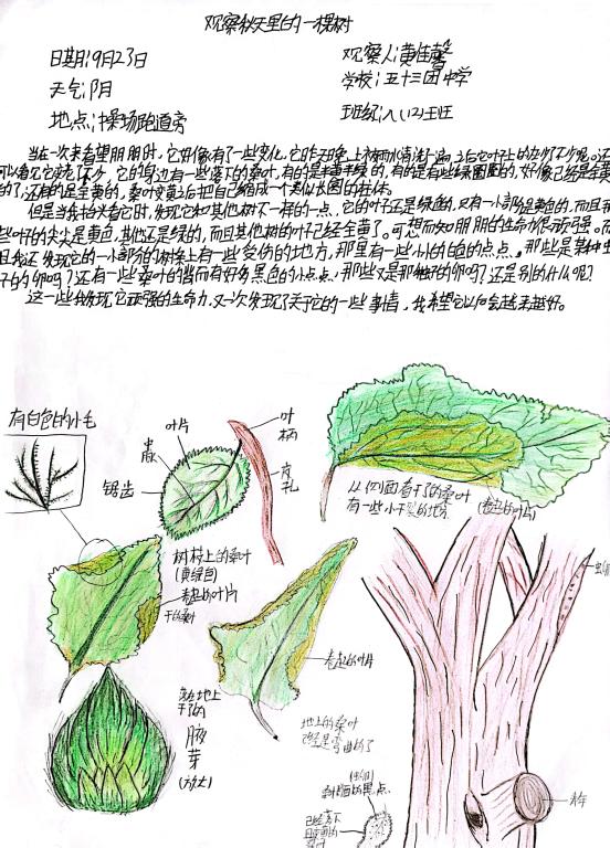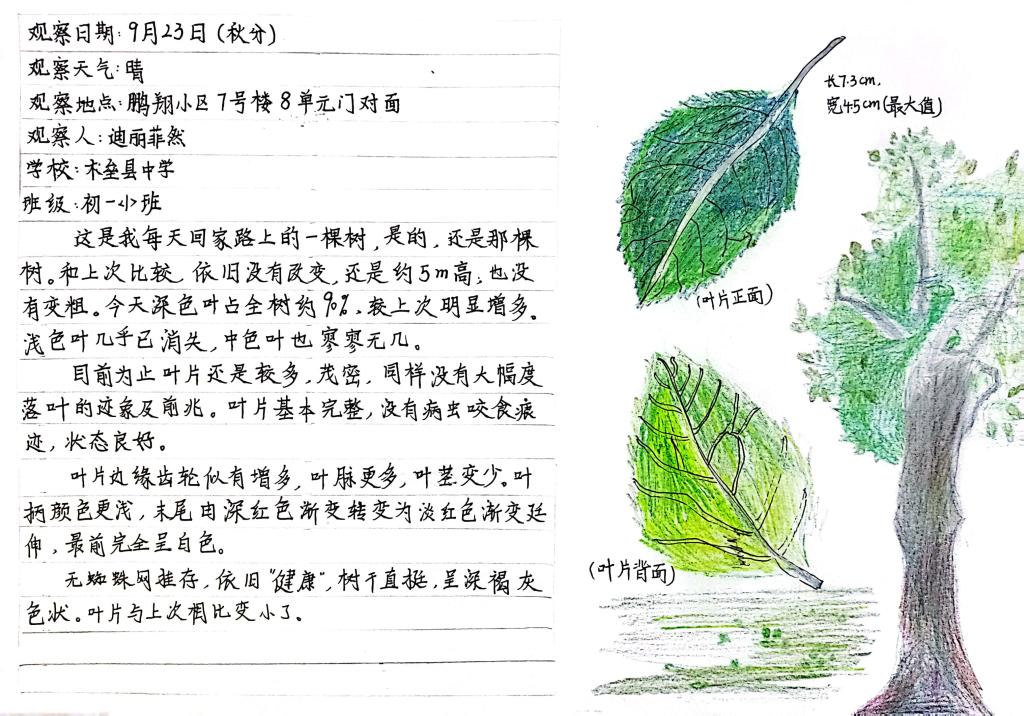 此次活動內容是觀察身邊的一棵樹,通過觀察和感受見證秋季樹木的變化,完成對一棵樹的陪伴?;顒酉嚓P通知得到全國科普日、自治區科協、新疆植物學會等相關平臺的廣泛宣傳,全疆各大、中、小學教師積極組織學生參與,共有123位指導老師報名參與此次活動,有近2500名學生報名參加,大多數參與者為初高中學生,參與學生遍布南北疆,觀察的樹木種類較豐富,作品不僅展現出新疆不同地區物候差異,以及不同氣候條件下的物種特點,同時,也展現出同學們關注自然,渴望自然的心聲。激發大家通過五感近距離感受一棵樹跟隨節氣的變化,鼓勵大家通過觀察與植物建立聯結,感受節氣變化下的樹木變化,感受中國傳統文化和植物節律的關系,從而重新關注身邊被忽略的樹木和其他植物。同時,作品也展現了廣大學生豐富、細膩的觀察、感受和想象力。不僅可以觀察樹木的全貌,還通過細微的對局部的觀察,體會每一種樹木的與眾不同,尋找與樹木和諧相處的鄰居。
