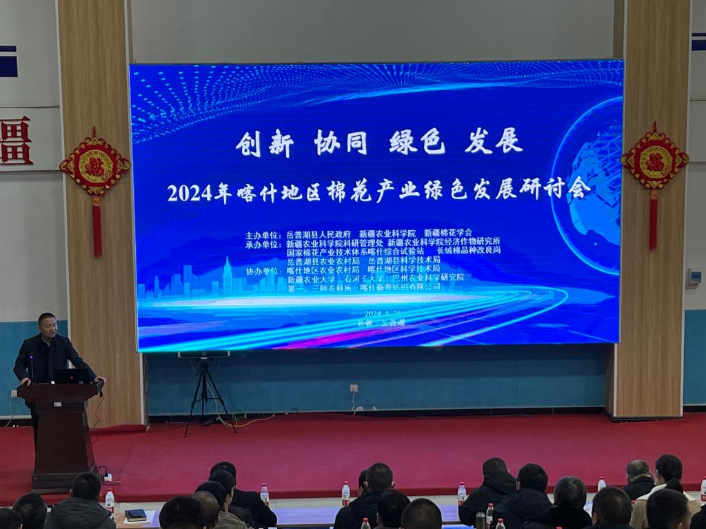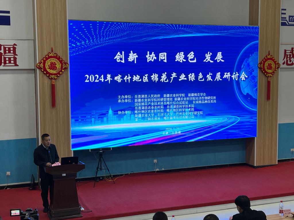2024年1月25日-26日,由新疆農(nóng)業(yè)科學(xué)院、岳普湖縣人民政府、新疆棉花學(xué)會主辦,新疆農(nóng)業(yè)科學(xué)院經(jīng)濟(jì)作物研究所、新疆農(nóng)業(yè)科學(xué)院科研管理處、國家棉花產(chǎn)業(yè)技術(shù)體系喀什試驗(yàn)站、岳普湖縣農(nóng)業(yè)農(nóng)村局、岳普湖縣科學(xué)技術(shù)局聯(lián)合承辦的2024年喀什地區(qū)棉花產(chǎn)業(yè)綠色發(fā)展研討會在岳普湖縣召開。來自山東省農(nóng)業(yè)科學(xué)院、新疆農(nóng)業(yè)大學(xué)、石河子大學(xué)等疆內(nèi)外科研高校專家,國家和自治區(qū)棉花產(chǎn)業(yè)技術(shù)體系專家,喀什地區(qū)農(nóng)村局等地區(qū)相關(guān)部門負(fù)責(zé)人、喀什地區(qū)12個縣市農(nóng)業(yè)相關(guān)部門負(fù)責(zé)人,相關(guān)企業(yè)、合作社、種植大戶代表等共110余人參加會議。