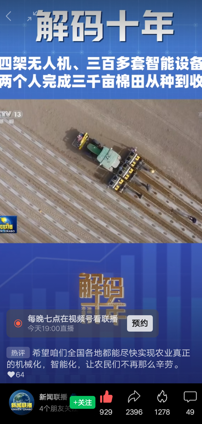 2021年在新疆巴音郭楞蒙古自治州尉犁縣廣茂的棉田上出現(xiàn)了從未有過的身影,兩個人四架無人機300多套智能設(shè)備,完成3000棉田的從種到收的全過程。通過農(nóng)業(yè)無人化設(shè)備采集的農(nóng)業(yè)地理信息數(shù)據(jù)、農(nóng)業(yè)生產(chǎn)數(shù)據(jù)、作物生長數(shù)據(jù)及生長環(huán)境數(shù)據(jù),讓農(nóng)民掌控土地、作物與農(nóng)事控管全過程,結(jié)合農(nóng)業(yè)專業(yè)知識,首創(chuàng)農(nóng)業(yè)人工智能與智慧農(nóng)場管理平臺,輔助生產(chǎn)者做出科學(xué)的農(nóng)事決策。巴州極飛航空科技有限公司科技創(chuàng)新負責(zé)人艾海鵬說:“兩個人挑戰(zhàn)3000畝超級棉田,哇,看看能不能用我們科技,再給農(nóng)業(yè)帶來一些新的變化?”無人播種機在大地上拖出筆直痕跡,路線誤差在2.5厘米以內(nèi),澆灌、檢測、施肥一個小小的平板電腦就能搞定,當(dāng)收獲的季節(jié)到來,采棉機在這塊三千畝的棉田共收獲棉花七百噸,曾今依靠傳統(tǒng)方式種植的尉犁縣農(nóng)業(yè)生產(chǎn),現(xiàn)在插上一個個數(shù)字科技的翅膀,以超乎想象的速度邁向農(nóng)業(yè)現(xiàn)代化建設(shè)。