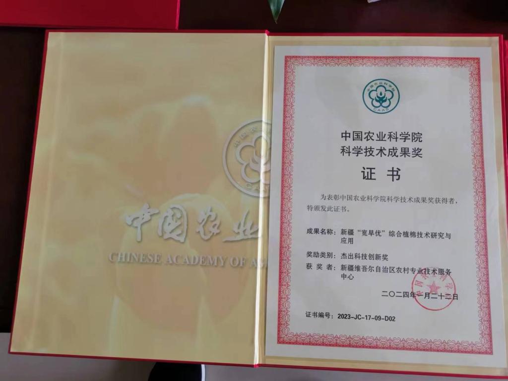 2024年4月,中國農(nóng)科院發(fā)布信息,新疆農(nóng)村專業(yè)技術(shù)服務(wù)中心申報的《新疆“寬早優(yōu)”綜合植棉技術(shù)研究與應(yīng)用》課題,獲得中國農(nóng)業(yè)科學(xué)院“杰出科技創(chuàng)新獎”。同時,新疆科協(xié)王光強和中棉所張西嶺、宋美珍主持的《新疆“寬早優(yōu)”植棉》專著,榮獲中國農(nóng)業(yè)科學(xué)技術(shù)出版社“第二屆農(nóng)業(yè)科技圖書獎優(yōu)秀獎”。