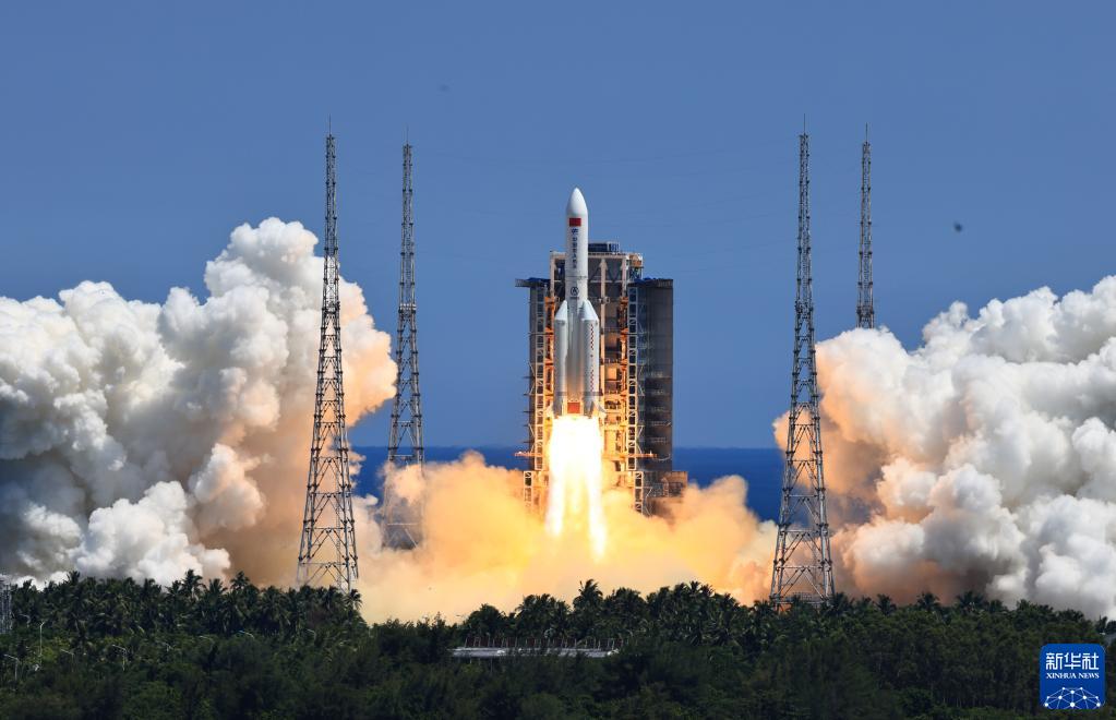 2022年7月24日,搭載問天實驗艙的長征五號B遙三運載火箭,在我國文昌航天發射場點火發射。新華社記者 李剛 攝