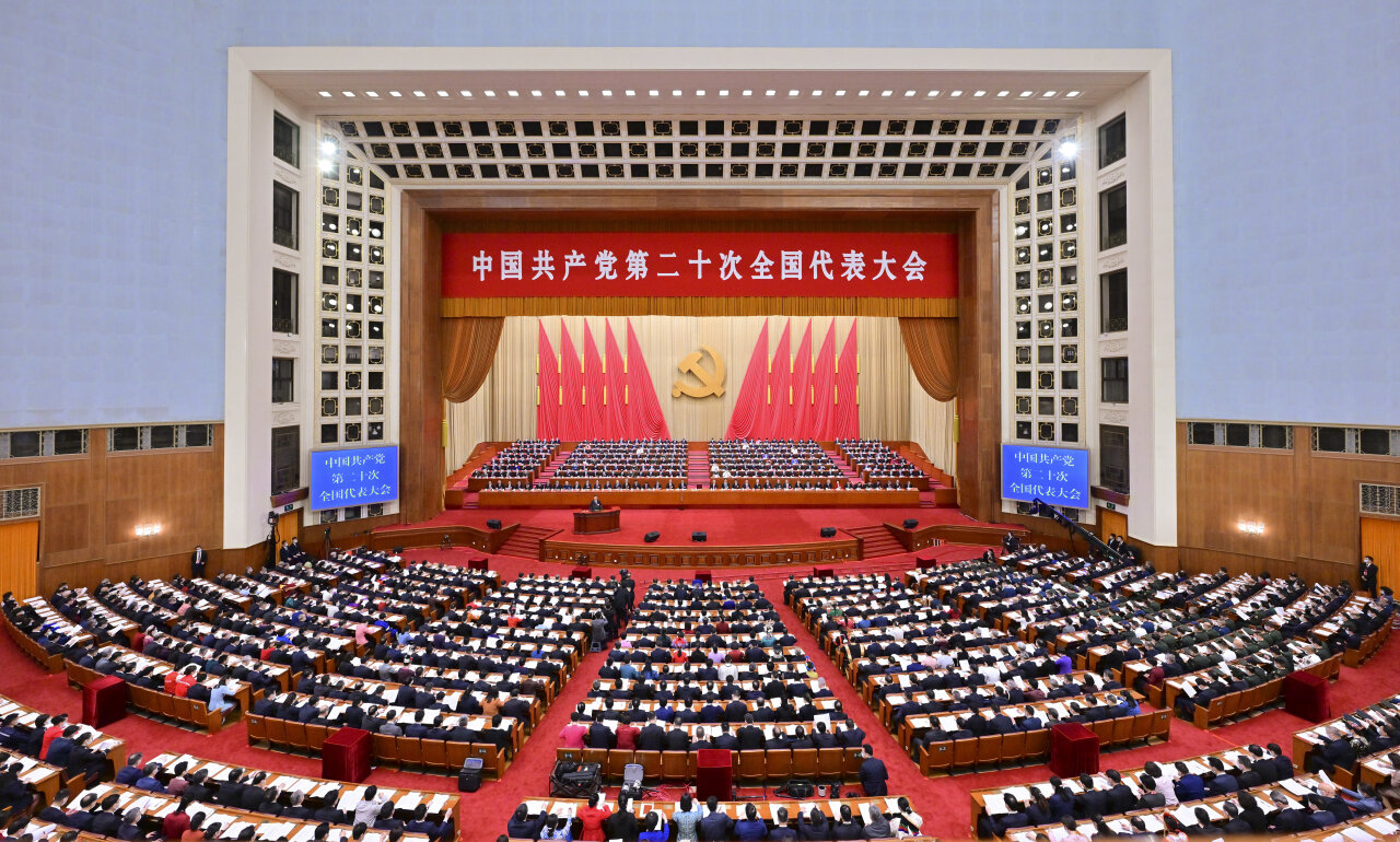 人民大會堂雄偉莊嚴,萬人大禮堂氣氛熱烈。主席臺上方懸掛著“中國共產黨第二十次全國代表大會”的會標,后幕正中是鐮刀和錘頭組成的黨徽,10面鮮艷的紅旗分列兩側。二樓和三樓眺臺上分別懸掛著“高舉中國特色社會主義偉大旗幟,全面貫徹習近平新時代中國特色社會主義思想,弘揚偉大建黨精神,為全面建設社會主義現代化國家、全面推進中華民族偉大復興而團結奮斗!”“偉大、光榮、正確的中國共產黨萬歲!”的橫幅。