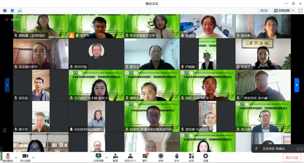 本屆年會以“干旱區(qū)生物多樣性保護、可持續(xù)利用與綠色生計”為主題,來自中科院新疆生態(tài)與地理研究所、新疆大學、新疆師范大學、新疆農業(yè)大學、塔里木大學、石河子大學、伊犁師范大學、自治區(qū)中藥民族藥研究所等單位的400余人通過騰訊會議和釘釘直播方式在線參會。