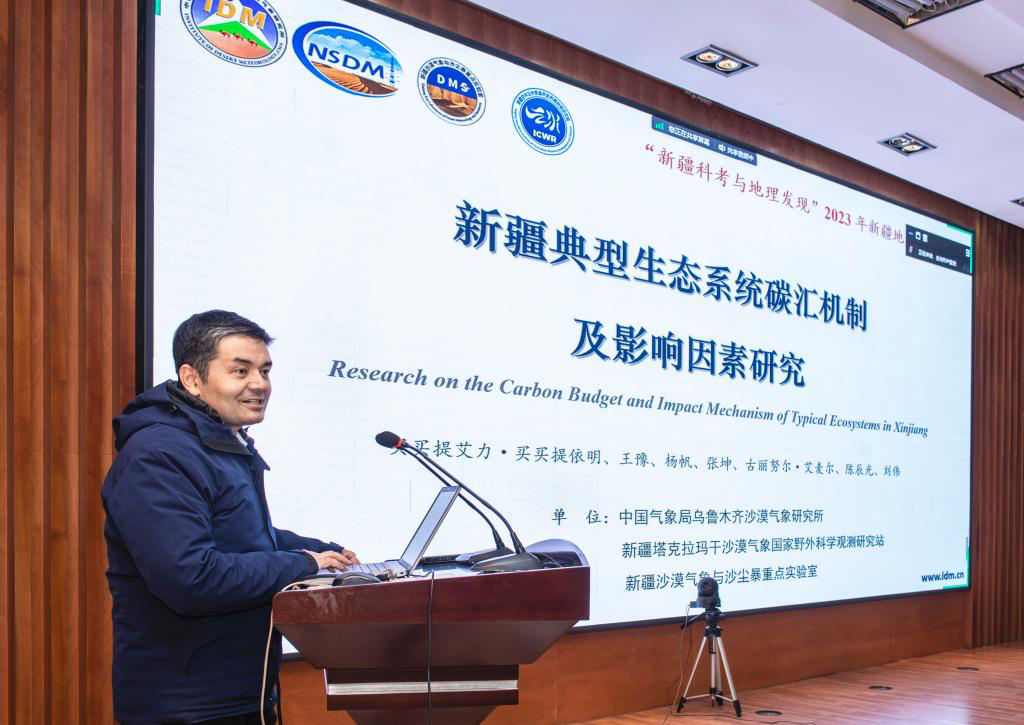 主旨報告環(huán)節(jié),中國科學(xué)院新疆生態(tài)與地理研究所高鑫研究員,新疆大學(xué)地理與遙感科學(xué)學(xué)院院長張峰教授,中國氣象局烏魯木齊沙漠氣象研究所所長買買提艾力?買買提依明研究員,新疆師范大學(xué)地理科學(xué)與旅游學(xué)院副院長阿里木江?卡斯木教授,塔里木大學(xué)生命科學(xué)與技術(shù)學(xué)院副院長夏占峰教授分別以“塔克拉瑪干沙漠典型沙丘發(fā)育機理”“塔克拉瑪干沙漠沙物質(zhì)的空間分異特征”“新疆典型生態(tài)系統(tǒng)碳匯機制及影響因素研究”“天山北坡城市群高質(zhì)量發(fā)展的資源支撐潛力研究”“沙漠微生物資源與地理生態(tài)分布”為題作主旨報告。