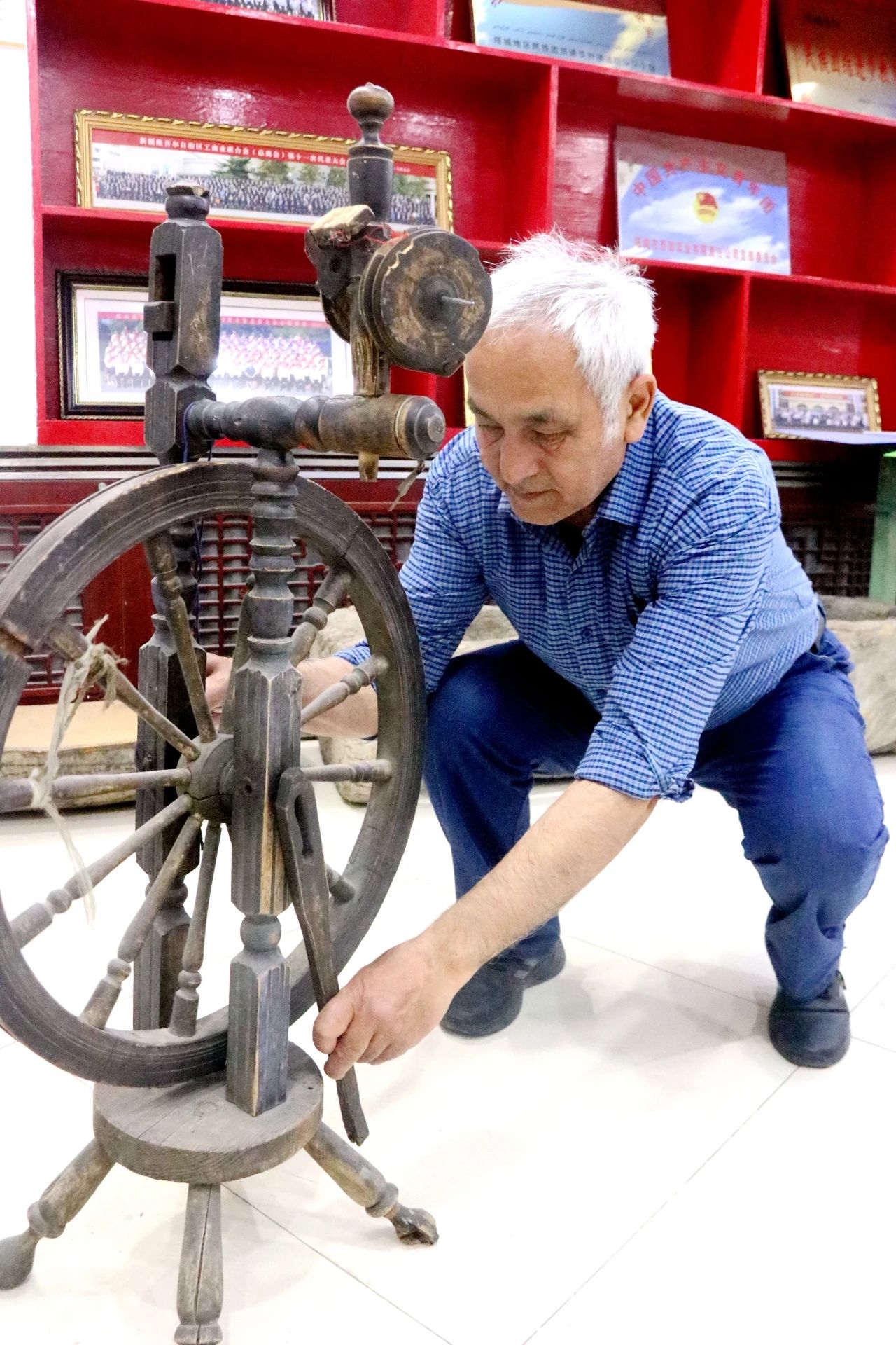 阿地里·阿不都熱合曼在塔城市黨群活動中心西部紅色驛站收拾老物件