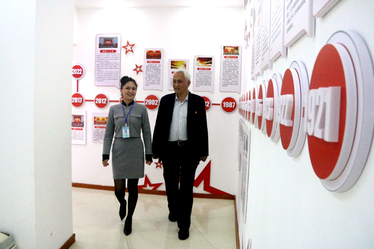 阿地里·阿不都熱合曼在塔城市黨群活動中心西部紅色驛站給塔城市第五小學206班學生講解紅色知識
