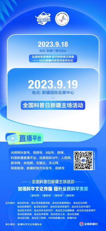 主要內(nèi)容:小學(xué)生《啟明星》情景劇表演;20位新疆科學(xué)文化傳播大使聘任儀式;王小東院士進(jìn)疆60周年紀(jì)念活動(dòng);新疆原創(chuàng)優(yōu)秀科普書籍、音視頻作品、科普劇等展演;“放飛天山科技云號(hào)飛船”啟動(dòng)儀式。