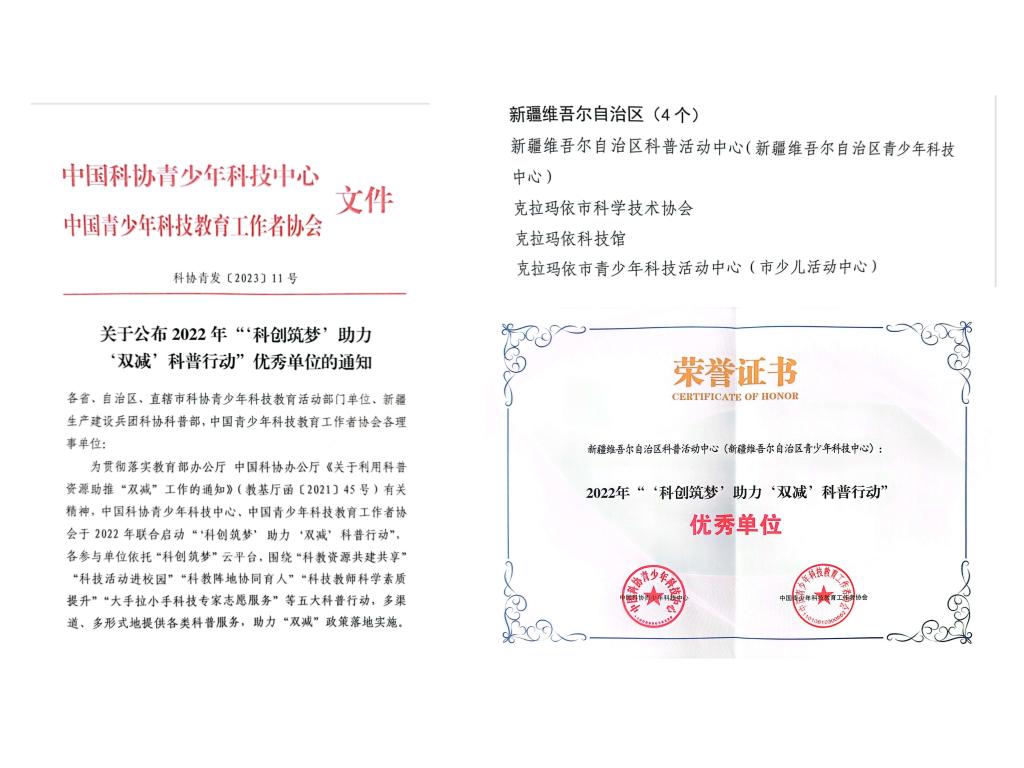 近日,新疆科普活動中心(青少年科技中心)、克拉瑪依市科學技術協(xié)會、克拉瑪依科技館和克拉瑪依市青少年科技活動中心4家單位,被中國科協(xié)青少年科技中心、中國青少年科技教育工作者協(xié)會評為2022年“?科創(chuàng)筑夢?助力?雙減?科普行動”優(yōu)秀單位。