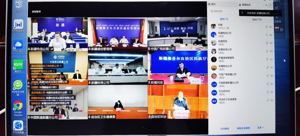 中國電信股份有限公司新疆分公司、中國移動通信集團新疆有限公司、中國聯合網絡通信有限公司新疆分公司、中國廣電新疆網絡股份有限公司、中國鐵塔股份有限公司新疆分公司作為信息通信行業代表作主題發言。 近300位來自全區的基礎電信運用企業、信息通信建設等企業有關負責人和專家學者在線參會。