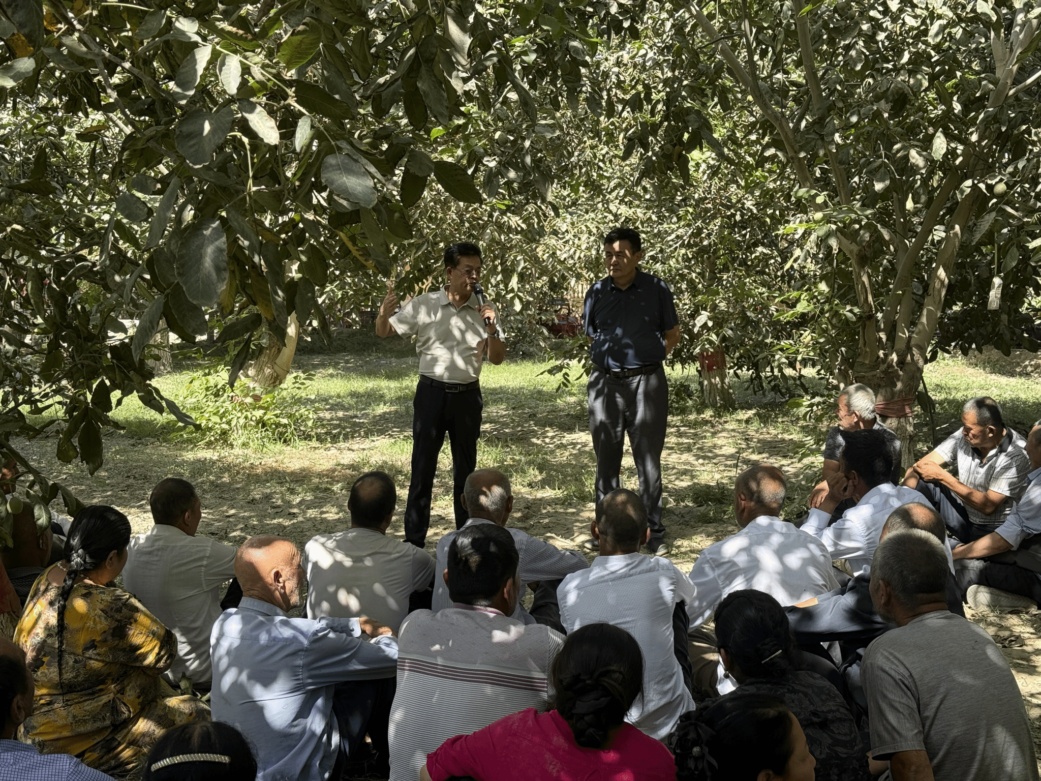 在瓊庫爾艾日克村的核桃地里,新疆農科院果蔬研究所艾爾買克·才卡斯木研究員,向農民講授核桃和紅棗栽培關鍵技術,他聲情并茂地示范核桃夏季的修剪技法。“核桃結果期修剪要注意以‘去強留弱枝條’法為主,核桃樹側枝條背上直立長出來的徒長枝條要除掉、主干上延長直立長得強長枝條要除掉或者回縮等技術,注意打開光路,這樣才能結出優質果。”“大家記住,紅棗現在要重點防治裂果,紅棗主要裂果(70%-80%)原因是與灌溉水有關,南疆8月初開始紅棗果園應該注意控制水,葉面噴施氨基酸鈣等肥料追肥!”在場的果農們紛紛掏出手機錄制視頻,生怕漏掉任何一個細節。種植大戶依明尼亞孜·托合提尼亞孜感慨道:“專家就是專家!我這十幾年白種了,原來修剪還有這么多講究!”