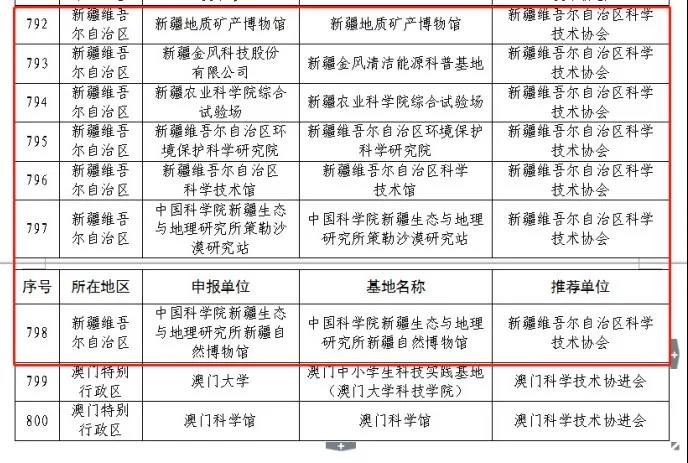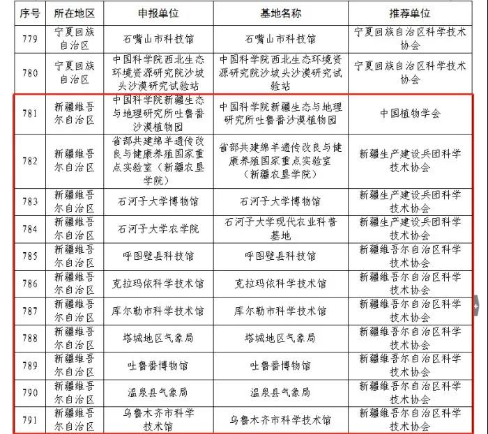 近日中國(guó)科學(xué)技術(shù)協(xié)會(huì)公布了2021—2025年第一批全國(guó)科普教育基地新疆18家單位上榜包括中國(guó)科學(xué)院新疆生態(tài)與地理研究所吐魯番沙漠植物園、石河子大學(xué)博物館、克拉瑪依科學(xué)技術(shù)館、溫泉縣氣象局等