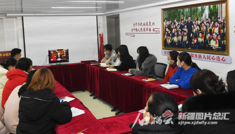 2021年12月31日,在烏魯木齊市沙依巴克區友好北路片區石家園子社區,干部群眾收看國家主席習近平發表二〇二二年新年賀詞。石榴云/新疆日報記者 阿扎提·玉素甫江攝