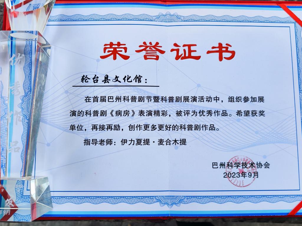 近日,巴州科學技術協(xié)會公布“首屆巴州科普劇節(jié)暨科普劇展演活動”獲獎單位,輪臺縣文化館創(chuàng)作的科普劇《病房》經(jīng)專家評審和復核,入圍大眾類科普作品現(xiàn)場決賽,評為優(yōu)秀作品,并代表全州八縣一市獲獎單位,在“首屆巴州科普劇節(jié)暨科普劇展演活動”頒獎典禮上表態(tài)發(fā)言。
