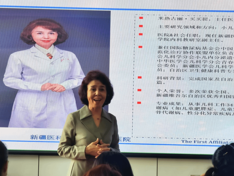 活動主會場設在和田市衛健委,吸引了眾多市人民醫院的醫護工作者參與。同時,通過藍衛通系統,各縣市的180余名醫護人員也在線接受了培訓。新疆醫科大學第一附屬醫院兒科中心小兒內四科主任米熱古麗·買買提以“兒童T1DM診療難點與思考”為題,深入淺出地進行講解,現場互動熱烈。